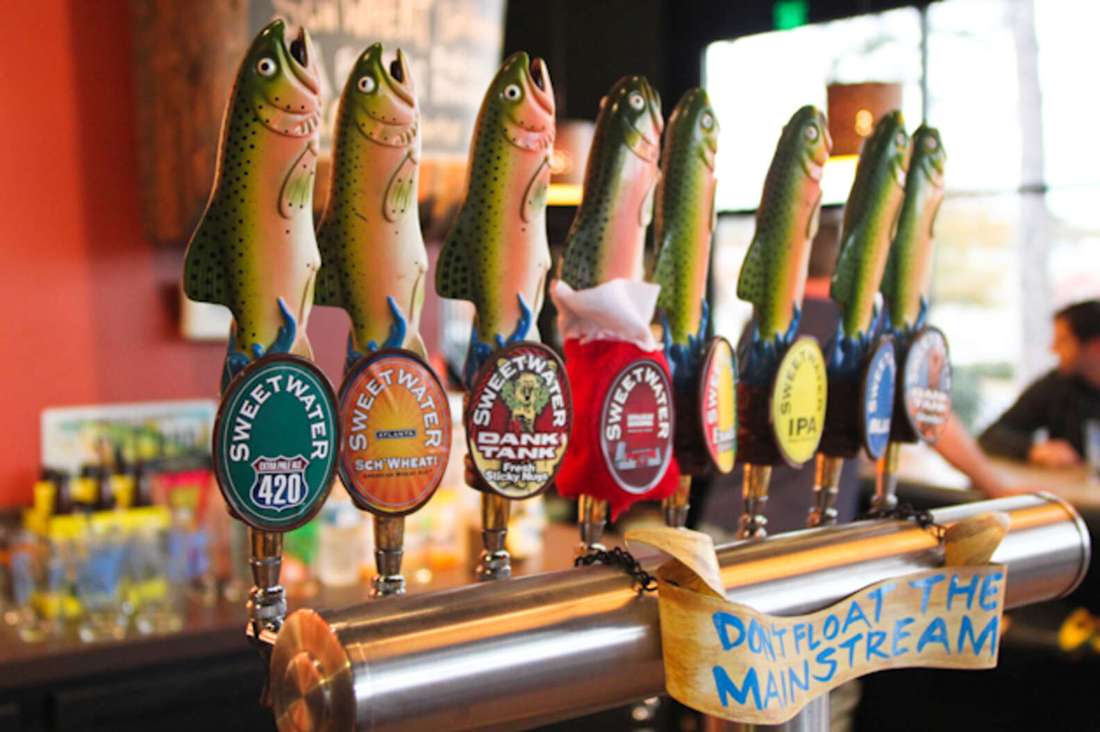 But consumer interactions extend beyond the bending of an elbow to quaff a brew made with a secret recipe. A beer can or bottle can feature copyrightable artwork, like the expressive and colorful sci-fi scenes adorning the labels at my local brewery, Kings County Brewers Collective. Fancy tap handles may also merit copyright protection, either as two-dimensional artworks or three-dimensional sculptures, like SweetWater’s fishy tap handles or SingleCuts rockin’ tap handles. Craft breweries also set themselves apart and attract through other creative decorative choices, like ornamentation adorning bars or fanciful beer or tap list signs, which may be copyrightable. Further, if unique enough, a tap room might even claim trade dress rights in the exterior or interior designs and architectures.[6]