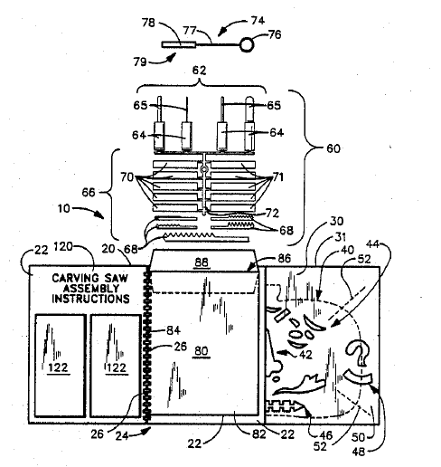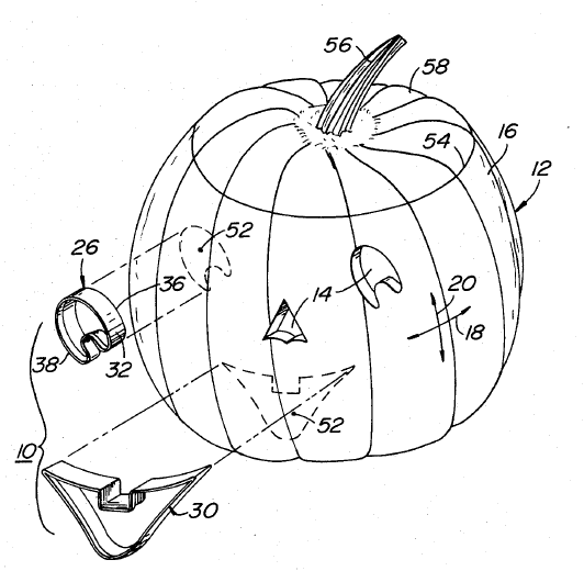 pumpkin designs. In 1989, Patent No. 4,828,114 was issued to Pumpkin Inc. (now called Pumpkin Masters) for a Pumpkin Carving Kit. The kit includes different sets of cutting tools, pattern sheets, and directions about how to transfer a complex design onto the surface of a pumpkin so it can be carved. As intricately carved pumpkins increased in popularity so did Pumpkin’s enforcement efforts. At least 50 lawsuits were filed from 1992 to 2002 to enforce patent rights to the carving kit, including lawsuits brought against Kmart, Kraft, Disney, Williams-Sonoma, and Martha Stewart Living Omnimedia. All of the disputes were apparently quickly resolved. Of course, carving real pumpkins still requires dealing with pumpkin guts and afterwards the creation slowly rots away. If you like pumpkin carving but not the mess, you can always use a carveable polyurethane foam pumpkin, such as disclosed in Patent No. 5,491,007.
