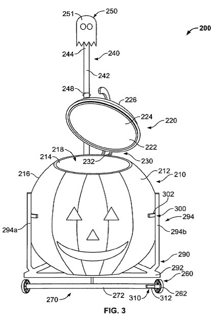 Anyone who has been trick-or-treating with children knows that the measure of a successful evening is the quantity of candy collected. Unfortunately, as their goody bags get full, small children find them harder to carry. By the end of the night, it is usually the parents who end up carrying the bags of treats and this can expose the candy to unauthorized sampling. Where there is a problem – there are inventors with solutions. U.S. Patent No. 7,584,669 discloses a portable container for storing and transporting a candy haul. The container is shaped like a pumpkin, witch, ghost, goblin, monster, vampire, or werewolf and is mounted in a frame with wheels and a handle. One important feature set out in the patent is a cover that “protects a