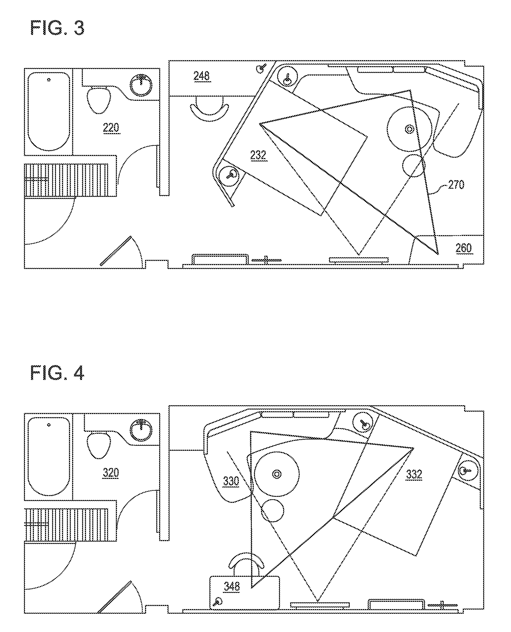 Example 1: Did you know that you might be in a hotel room that is protected by patent? U.S. Patent No. 9,194,143 is owned by Six Continents Hotels, Inc., which is a company related to Holiday Inn. They received patent protection for the layout of a hotel room, where (in some claims) the room includes a bed, a television, a sofa at an acute angle relative to the bed, and a bathroom, and also an angled wall behind the headboard, such that both the bed and the sofa face the television at similar angles and there is a pocket space behind the bed. See the figures below, reprinted from the patent.